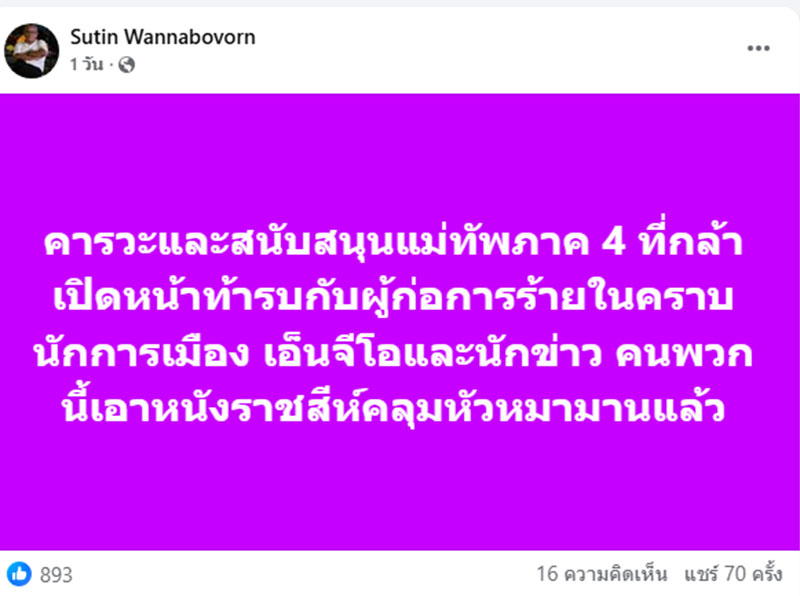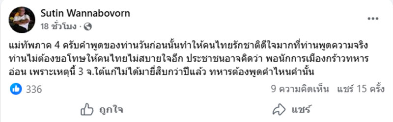 อย่างไรก็ตาม ก่อนหน้านี้ นายสุทิน โพสต์ข้อความว่า แม่ทัพภาค 4 ครับคำพูดของท่านวันก่อนนั้นทำให้คนไทยรักชาติดีใจมากที่ท่านพูดความจริง ท่านไม่ต้องขอโทษให้คนไทยไม่สบายใจอีก ประชาชนอาจคิดว่า พอนักการเมืองกร้าวทหารอ่อน เพราะเหตุนี้ 3 จังหวัดชายแดนใต้แก้ไม่ได้มา 20 กว่าปีแล้ว ทหารต้องพูดคำไหนคำนั้น