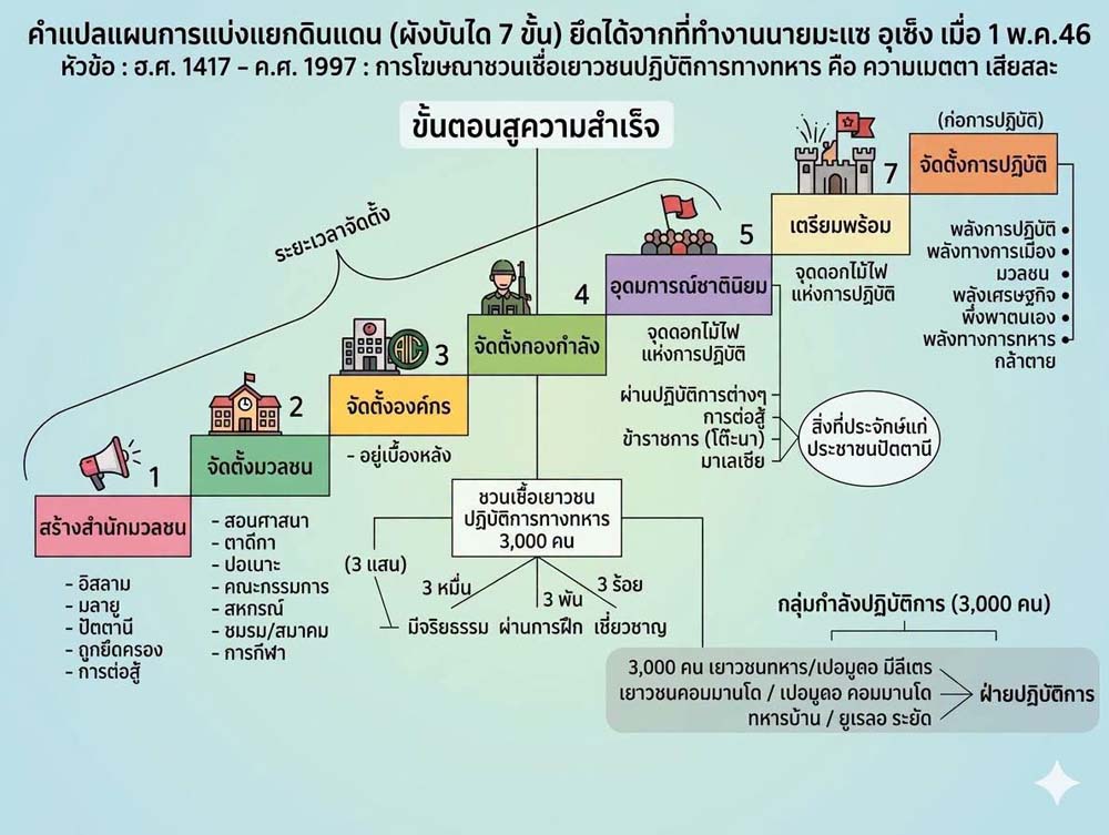 สิ่งที่เห็นชัดที่สุดคือ แผนนี้ให้ความสำคัญกับ “การสร้างคน” มากกว่า “การใช้กำลัง” กล่าวคือ อาวุธอาจเป็นเพียงปลายทาง แต่ต้นทางคือความคิด อัตลักษณ์ และเครือข่ายสังคม หากมองในมุมนี้ เหตุการณ์ความไม่สงบที่เกิดขึ้นในช่วงหลังปี 2547 จึงอาจไม่ใช่เรื่องฉับพลัน แต่เป็นผลของการสะสมในระยะยาวตามตรรกะของการจัดตั้งแบบเป็นขั้นตอน
