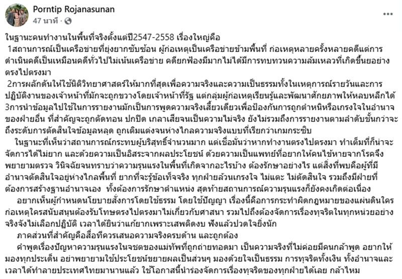 วันที่ 18 เมษายน 2569 แพทย์หญิง คุณหญิง พรทิพย์ โรจนสุนันท์ อดีตสมาชิกวุฒิสภา ได้โพสต์ข้อความระบุว่า ในฐานะคนทำงานในพื้นที่จริงตั้งแต่ปี2547-2558 เรื่องใหญ่คือ