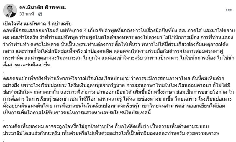 วันที่ 20 เมษายน 2569 ดร.หิมาลัย ผิวพรรณ ที่ปรึกษาหัวหน้าพรรคกล้าธรรม ได้โพสต์ข้อความระบุว่า เปิดใจฟัง แม่ทัพภาค 4 ดูบ้างครับ