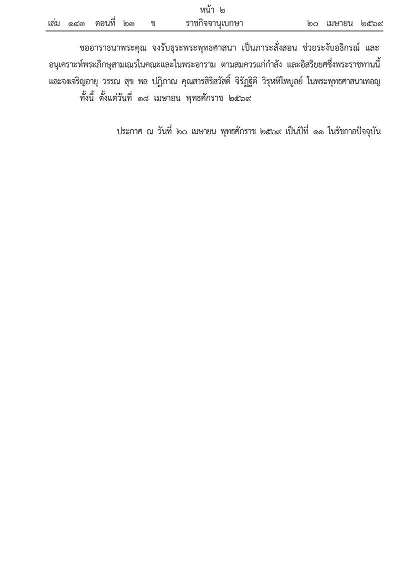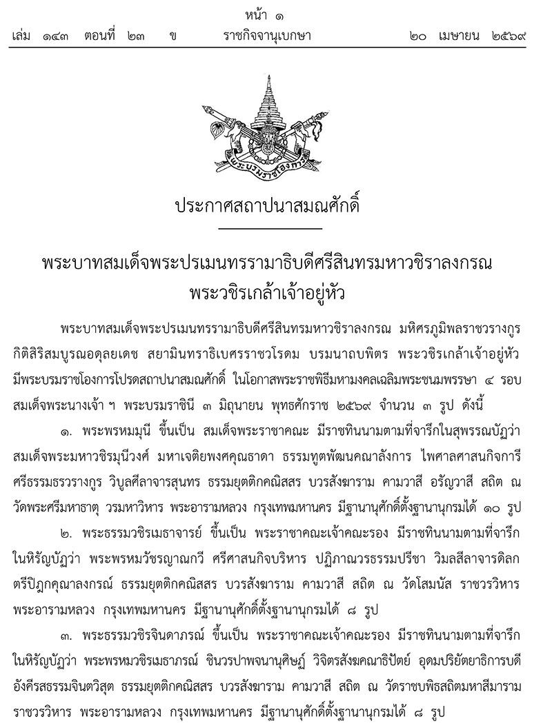 วันที่ 20 เมษายน 2569 เว็บไซต์ราชกิจจานุเบกษา เผยแพร่ประกาศสถาปนาสมณศักดิ์ พระบาทสมเด็จพระปรเมนทรรามาธิบดีศรีสินทรมหาวชิราลงกรณ มหิศรภูมิพลราชวรางกูร กิติสิริสมบูรณอดุลยเดช สยามินทราธิเบศรรรรโรดม บรมนาถบพิตร พระวชิรเกล้าเจ้าอยู่หัว มีพระบรมราชโองการโปรดสถาปนาสมศักดิ์ ในโอกาสพระราชพิธีมหามงคลเฉลิมพระชนมพรรษา 4 รอบ สมเด็จพระนางเจ้า ฯ พระบรมราชินี 3 มิถุนายน พุทธศักราช 2569 จำนวน 3 รูป ดังนี้