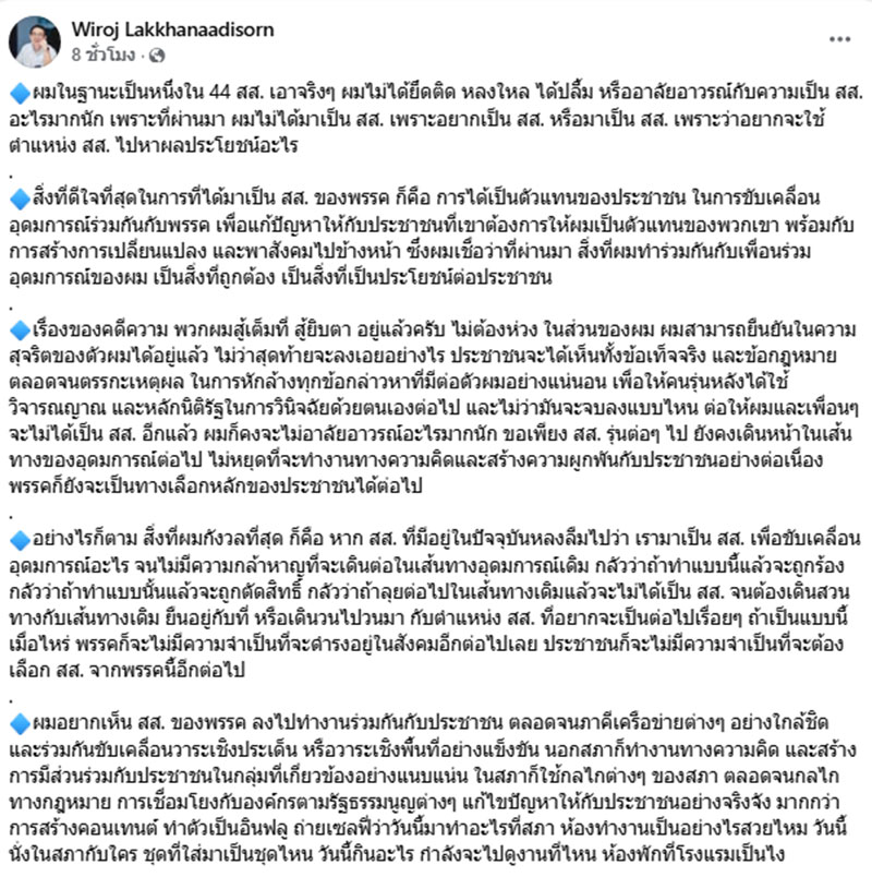 อย่างไรก็ตาม สิ่งที่ผมกังวลที่สุด ก็คือ หาก สส. ที่มีอยู่ในปัจจุบันหลงลืมไปว่า เรามาเป็น สส. เพื่อขับเคลื่อนอุดมการณ์อะไร จนไม่มีความกล้าหาญที่จะเดินต่อในเส้นทางอุดมการณ์เดิม กลัวว่าถ้าทำแบบนี้แล้วจะถูกร้อง กลัวว่าถ้าทำแบบนั้นแล้วจะถูกตัดสิทธิ์ กลัวว่าถ้าลุยต่อไปในเส้นทางเดิมแล้วจะไม่ได้เป็น สส. จนต้องเดินสวนทางกับเส้นทางเดิม ยืนอยู่กับที่ หรือเดินวนไปวนมา กับตำแหน่ง สส. ที่อยากจะเป็นต่อไปเรื่อยๆ ถ้าเป็นแบบนี้เมื่อไหร่ พรรคก็จะไม่มีความจำเป็นที่จะดำรงอยู่ในสังคมอีกต่อไปเลย ประชาชนก็จะไม่มีความจำเป็นที่จะต้องเลือก สส. จากพรรคนี้อีกต่อไป