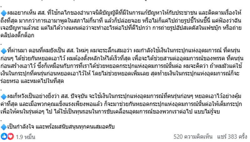 ผมอยากเห็น สส. ที่ใช้กลไกของอำนาจนิติบัญญัติที่มีในการแก้ปัญหาให้กับประชาชน และติดตามเรื่องให้ถึงที่สุด มากกว่าการเอามาพูดในสภาไม่กี่นาที แล้วก็ปล่อยจอย หรือไม่ก็แค่ไปถ่ายรูปชี้โน่นชี้นี่ แค่ฟ้องว่าฉันเจอปัญหาแล้วนะ แต่ไม่ได้วางแผนต่อว่าจะทำอะไรต่อไปที่ดีไปกว่า การถ่ายรูปอัปสเตตัสในเฟซบุ๊ก หรือถ่ายคลิปลงติ๊กต็อก
