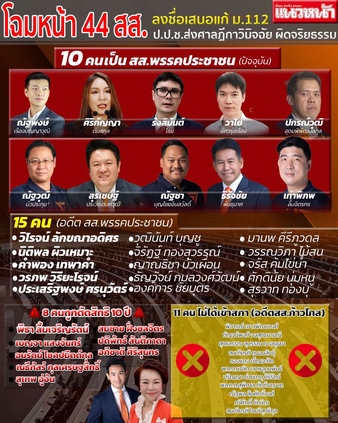 กรณีคณะกรรมการป้องกันและปราบปรามการทุจริตแห่งชาติ (ป.ป.ช.) ส่งคำร้องให้ศาลฎีกา พิจารณาว่า อดีตสมาชิกสภาผู้แทนราษฎร (สส.) พรรคก้าวไกล จำนวน 44 คน ฝ่าฝืนจริยธรรมอย่างร้ายแรง จากกรณีเสนอแก้ไขประมวลกฎหมายอาญา มาตรา 112 ซึ่งศาลฎีกานัดประชุมพิจารณาคำร้องในวันที่ 24 เมษายน 2569 นั้น รายงานข่าวแจ้งว่ากฎหมายรัฐธรรมนูญมาตรา 235 วรรค 3 ระบุว่า