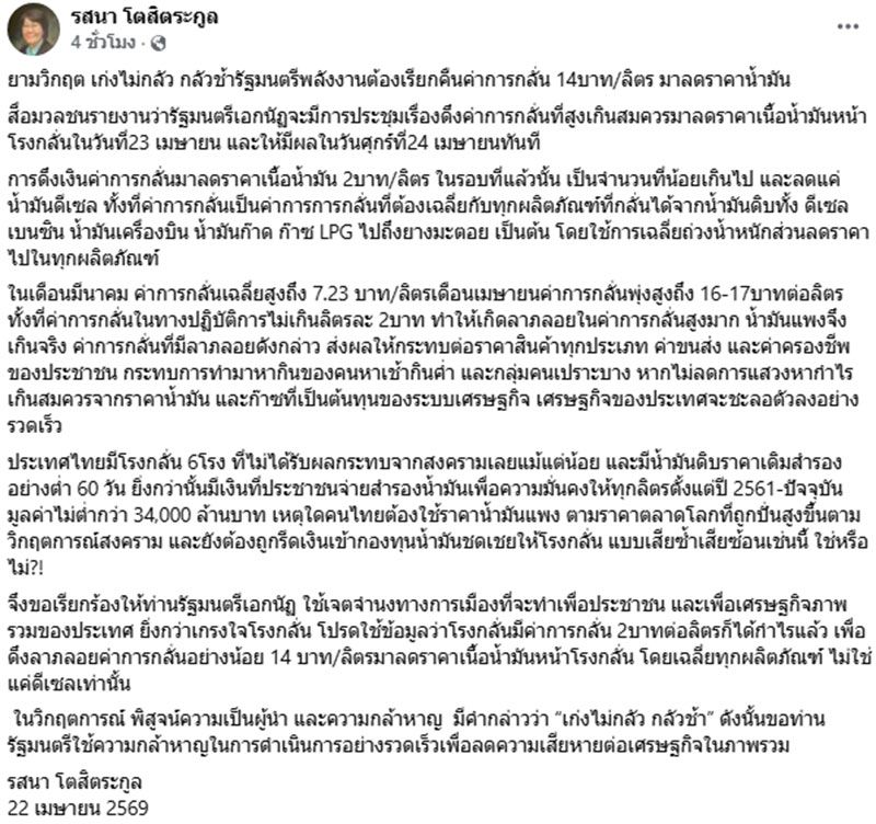 วันที่ 22 เมษายน 2569 นางรสนา โตสิตระกูล ประธานอนุกรรมการด้านบริการสาธารณะ พลังงาน และสิ่งแวดล้อม สภาผู้บริโภค (สภาองค์กรของผู้บริโภค) โพสต์ข้อความผ่านเฟซบุ๊ก ระบุว่า ยามวิกฤต เก่งไม่กลัว กลัวช้า รัฐมนตรีพลังงานต้องเรียกคืนค่าการกลั่น 14บาท/ลิตร มาลดราคาน้ำมัน