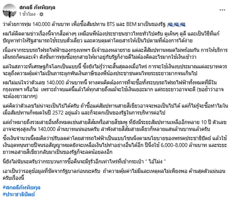 วันที่ 22 เมษายน 2569 นายสกลธี ภัททิยกุล รองหัวหน้าพรรคประชาธิปัตย์ (ปชป.) ได้โพสต์ข้อความระบุว่า ว่าด้วยการทุ่ม 140,000 ล้านบาท เพื่อซื้อสัมปทาน BTS และ BEM มาเป็นของรัฐ