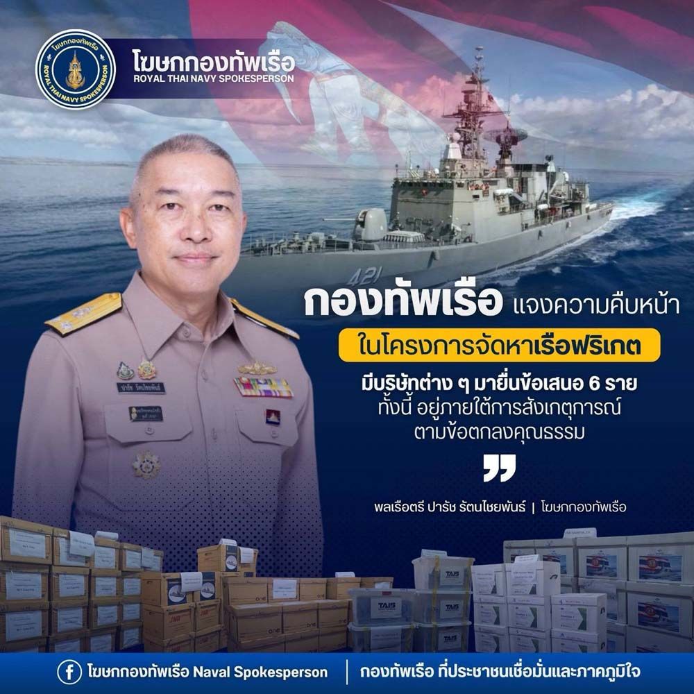 22 เมษายน 2569 พลเรือตรี ปารัช รัตนไชยพันธ์ โฆษกกองทัพเรือ ชี้แจงความคืบหน้าการดำเนินโครงการจัดหาเรือฟริเกต ตามขั้นตอนการเชิญชวนบริษัทผู้มีศักยภาพและมีประสบการณ์ในการต่อเรือฟริเกตจากหลายประเทศ เข้ายื่นข้อเสนอ จำนวน 11 ราย บัดนี้ ครบกำหนดเวลาแล้ว มีบริษัทฯ เข้ายื่นข้อเสนอจำนวน 6 ราย ได้แก่ 1.บริษัท Hyundai Heavy Industries Co., Ltd. (สาธารณรัฐเกาหลี) 2.บริษัท Singapore Technologies Engineering Ltd. (สาธารณรัฐสิงคโปร์) 3.บริษัท Askeri Fabrika ve Tersane İşletmeleri A.Ş. (สาธารณรัฐตุรกี) 4.บริษัท TAIS Gemi İnşa ve Teknoloji A.Ş. (สาธารณรัฐตุรกี) 5.บริษัท Hanwha Ocean Co., Ltd. (สาธารณรัฐเกาหลี) และ 6.บริษัท Navantia S.A. (ราชอาณาจักรสเปน)