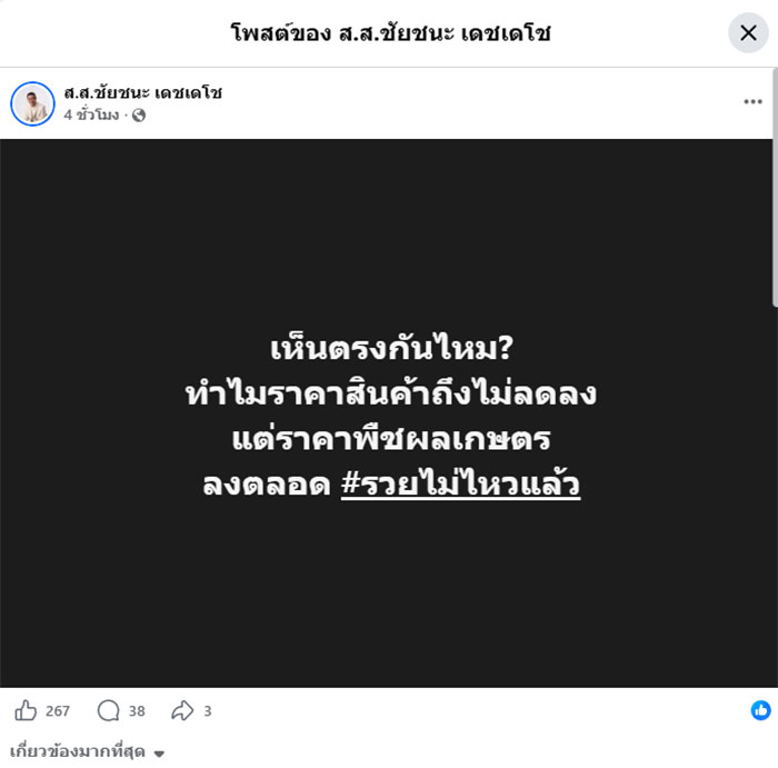 ล่าสุดวันนี้ (23 เม.ย.) นายชัยชนะ โพสต์ข้อความผ่านเฟซบุ๊กระบุว่า "เห็นตรงกันไหม? ทำไมราคาสินค้าถึงไม่ลดลง แต่ราคาพืชผลเกษตรลงตลอด #รวยไม่ไหวแล้ว"