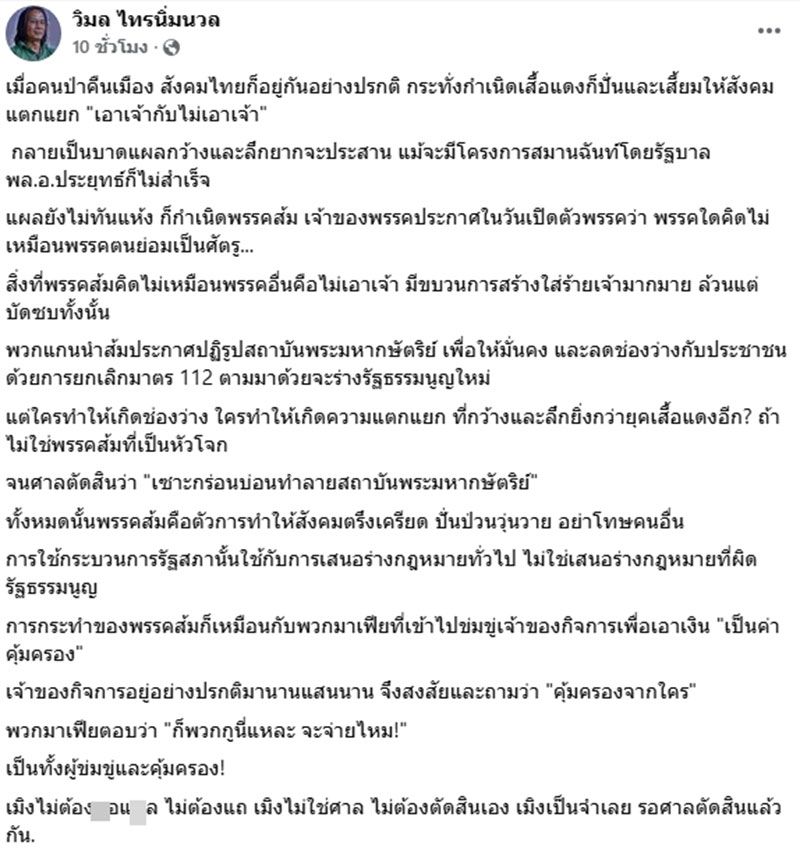 ล่าสุด วิมล ไทรนิ่มนวล นักเขียนรางวัลซีไรต์ ได้โพสต์ข้อความผ่านเฟซบุ๊กเกี่ยวกับเรื่องนี้ โดยระบุว่า เมื่อคนป่าคืนเมือง สังคมไทยก็อยู่กันอย่างปรกติ กระทั่งกำเนิดเสื้อแดงก็ปั่นและเสี้ยมให้สังคมแตกแยก "เอาเจ้ากับไม่เอาเจ้า" กลายเป็นบาดแผลกว้างและลึกยากจะประสาน แม้จะมีโครงการสมานฉันท์โดยรัฐบาลพล.อ.ประยุทธ์ก็ไม่สำเร็จ แผลยังไม่ทันแห้ง ก็กำเนิดพรรคส้ม เจ้าของพรรคประกาศในวันเปิดตัวพรรคว่า พรรคใดคิดไม่เหมือนพรรคตนย่อมเป็นศัตรู...