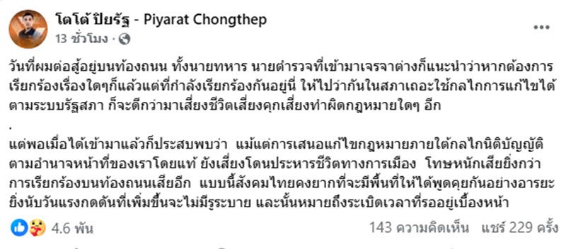 วันที่ 24 เมษายน 2569 นายปิยรัฐ จงเทพ สส.บัญชีรายชื่อ พรรคประชาชน โพสต์ข้อความผ่าน เฟซบุ๊ก โตโต้ ปิยรัฐ - Piyarat Chongthep ระบุว่า วันที่ผมต่อสู้อยู่บนท้องถนน ทั้งนายทหาร นายตำรวจที่เข้ามาเจรจาต่างก็แนะนำว่าหากต้องการเรียกร้องเรื่องใดๆก็แล้วแต่ที่กำลังเรียกร้องกันอยู่นี่ ให้ไปว่ากันในสภาเถอะใช้กลไกการแก้ไขได้ตามระบบรัฐสภา ก็จะดีกว่ามาเสี่ยงชีวิตเสี่ยงคุกเสี่ยงทำผิดกฎหมายใดๆ อีก