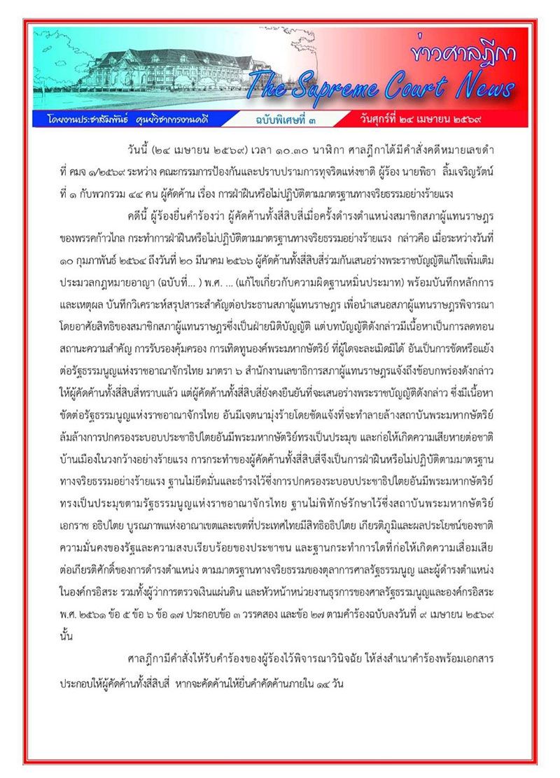วันที่ 24 เมษายน 2569 เวลา 10.30 น. ศาลฎีกาได้มีคำสั่งคดีหมายเลขดำที่ คมจ 1/2569 ระหว่าง คณะกรรมการป้องกันและปราบปรามการทุจริตแห่งชาติ ผู้ร้อง นายพิธา ลิ้มเจริญรัตน์ ที่ 1 กับพวกรวม 44 คน ผู้คัดค้าน เรื่อง การฝ้าฝืนหรือไม่ปฏิบัติตามมาตรฐานทางจริยธรรมอย่างร้ายแรง
