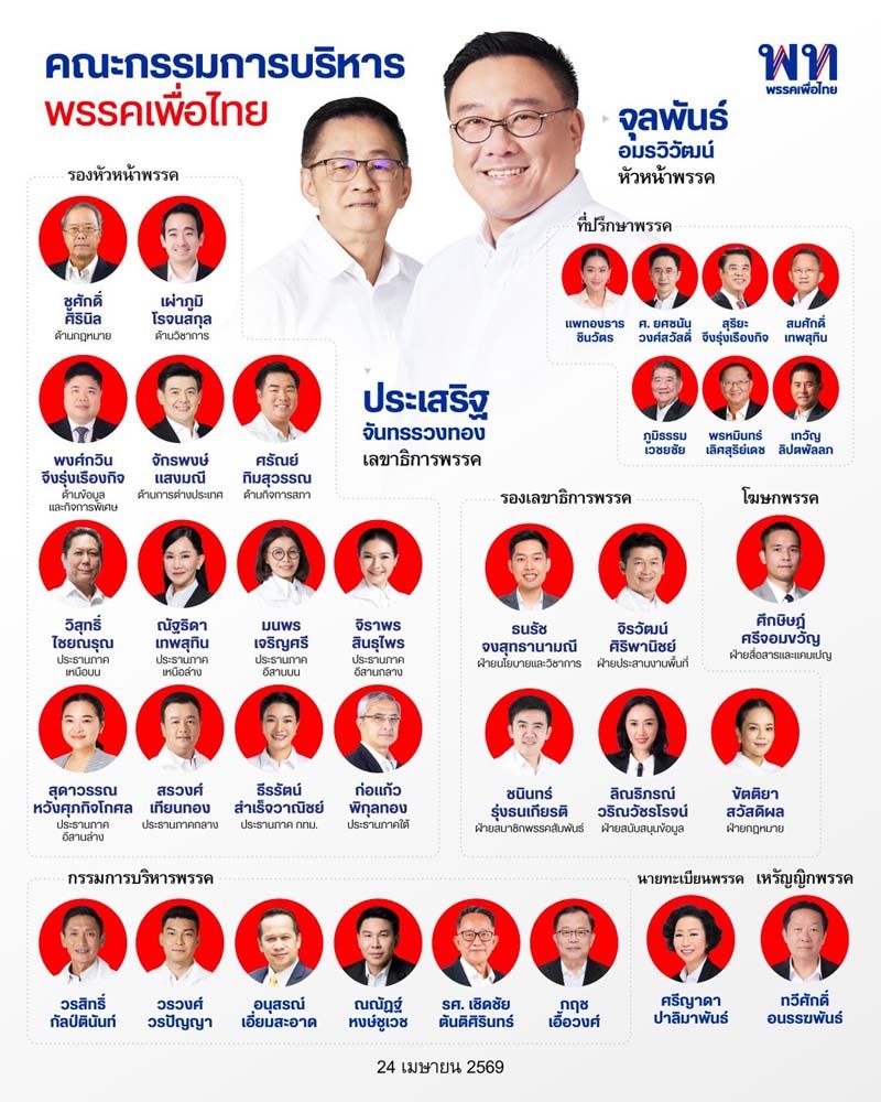 วันที่ 24 เมษายน 2569 ที่พรรคเพื่อไทย นายจุลพันธ์ อมรวิวัฒน์ หัวหน้าพรรคเพื่อไทย แถลงภายหลังการประชุมใหญ่สามัญประจำปี 2569 พรรคเพื่อไทย ถึงโครงสร้างกรรมการบริหารพรรคชุดใหม่ ว่า การประชุมพรรคครั้งนี้ นับเป็นครั้งแรกหลังการเลือกตั้งวันที่ 8 กุมภาพันธ์ที่ผ่านมาพรรคเพื่อไทยได้สรุปบทเรียนอย่างเป็นระบบตลอด 2 เดือนที่ผ่านมา ตราบที่ประชาชนยังต้องการคนทำงานให้ พรรคเพื่อไทยจะยังเดินหน้าต่อไป ไม่มีเหตุผลที่จะหยุด และวันนี้พรรคเพื่อไทยพร้อมแล้วที่ประกาศโครงสร้างการทำงานชุดใหม่ที่มุ่งให้ทุกปัญหามีเจ้าของ และทุกพื้นที่มีคนดูแล ตั้งแต่ระดับนโยบายถึงระดับภูมิภาคทั่วประเทศ และเมื่อยังต้องเดินต่อ หยุดไม่ได้ เราจึงต้องปรับตัวครั้งใหญ่ ทั้งโครงสร้าง ระบบงาน บุคลากร เทคโนโลยี ทั้งหมดนี้เพื่อทำให้พรรคยังเดินหน้าต่อไปได้ ด้วยแนวทางที่ ‘ถูกต้อง’ คู่กันไปกับงานบริหารราชการแผ่นดิน
