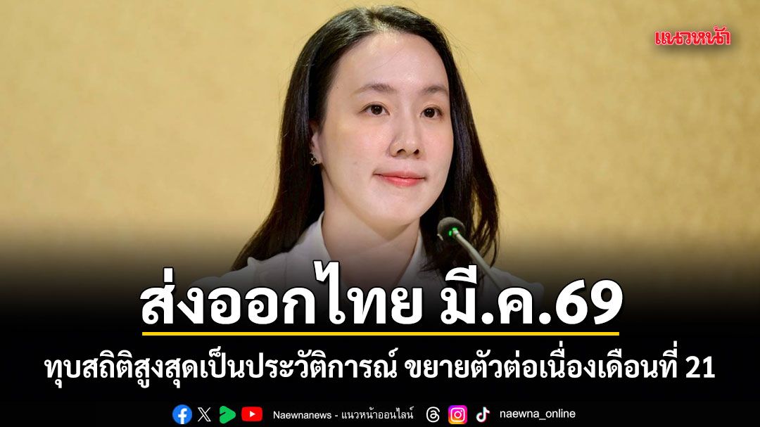 ส่งออกไทย มี.ค.69 ทุบสถิติสูงสุดเป็นประวัติการณ์ ขยายตัวต่อเนื่องเดือนที่ 21 รัฐบาลยังคงเดินหน้ารักษาแรงส่งการค้าไทย และเปิดตลาดใหม่ท่ามกลางความเสี่ยงโลก