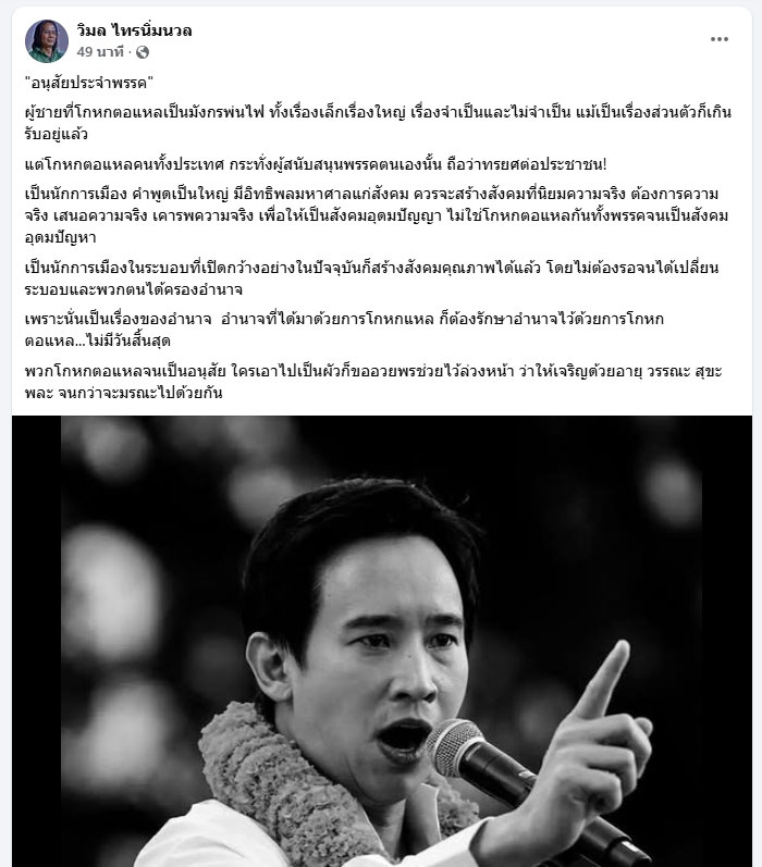 24 เมษายน 2569 วิมล ไทรนิ่มนวล นักเขียนรางวัลซีไรต์ ได้โพสต์ภาพของ นายพิธา ลิ้มเจริญรัตน์ อดีตหัวหน้าพรรคก้าวไกล พร้อมข้อความระบุว่า "อนุสัยประจำพรรค"