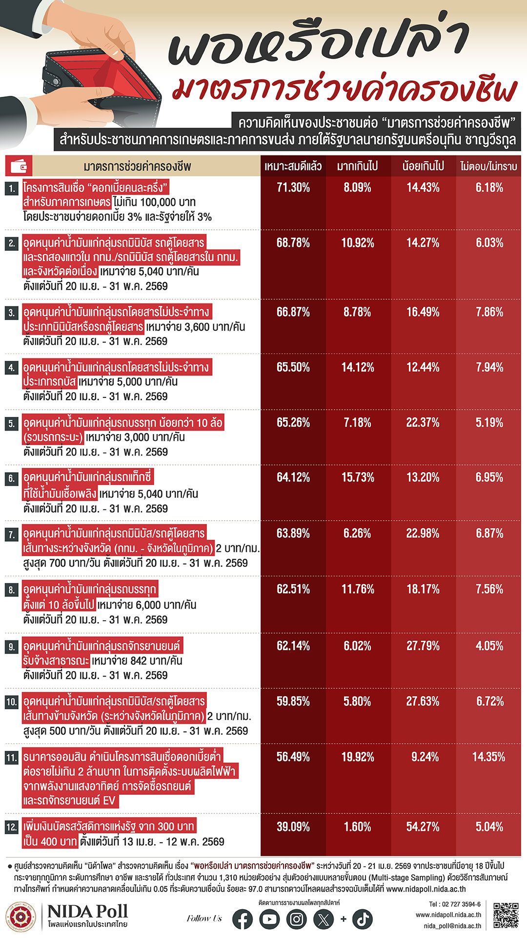 26 เมษายน 2569 ศูนย์สำรวจความคิดเห็น “นิด้าโพล” สถาบันบัณฑิตพัฒนบริหารศาสตร์ (นิด้า) เปิดเผยผลการสำรวจ เรื่อง “พอหรือเปล่า มาตรการช่วยค่าครองชีพ” ทำการสำรวจระหว่างวันที่ 20 - 21 เมษายน 2569 จากประชาชนที่มีอายุ 18 ปีขึ้นไป กระจายทุกภูมิภาค ระดับการศึกษา อาชีพ และรายได้ ทั่วประเทศ รวมจำนวนทั้งสิ้น 1,310 หน่วยตัวอย่าง เกี่ยวกับความคิดเห็นของประชาชนต่อมาตรการช่วยค่าครองชีพของรัฐบาล การสำรวจอาศัยการสุ่มตัวอย่างโดยใช้ความน่าจะเป็นจากบัญชีรายชื่อฐานข้อมูลตัวอย่างหลัก (Master Sample) ของ “นิด้าโพล” สุ่มตัวอย่างแบบหลายขั้นตอน (Multi-stage Sampling) เก็บข้อมูลด้วยวิธีการสัมภาษณ์ทางโทรศัพท์ โดยกำหนดค่าความคลาดเคลื่อนไม่เกิน 0.05 ที่ระดับความเชื่อมั่น ร้อยละ 97.0 จากการสำรวจเมื่อถามความคิดเห็นของประชาชนต่อ “มาตรการช่วยค่าครองชีพ” สำหรับประชาชนภาคการเกษตรและภาคการขนส่ง ภายใต้รัฐบาลนายกรัฐมนตรีอนุทิน ชาญวีรกูล พบว่า