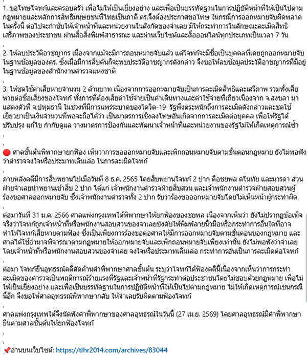 1. ขอโทษโจทก์และครอบครัว เพื่อไม่ให้เป็นเยี่ยงอย่าง และเพื่อเป็นบรรทัดฐานในการปฏิบัติหน้าที่ให้เป็นไปตามกฎหมายและหลักการสิทธิมนุษยชนที่ไทยเป็นภาคี ตร.จึงต้องประกาศขอโทษ ในกรณีการออกหมายจับผิดพลาดในครั้งนี้ ต่อไปจะกำชับให้เจ้าหน้าที่และหน่วยงานในสังกัดของจำเลย มิให้กระทำการในลักษณะละเมิดสิทธิเสรีภาพของประชาชน ผ่านสื่อสิ่งพิมพ์สาธารณะ และผ่านเว็บไซต์และสื่อออนไลน์ทุกประเภทเป็นเวลา 7 วัน
