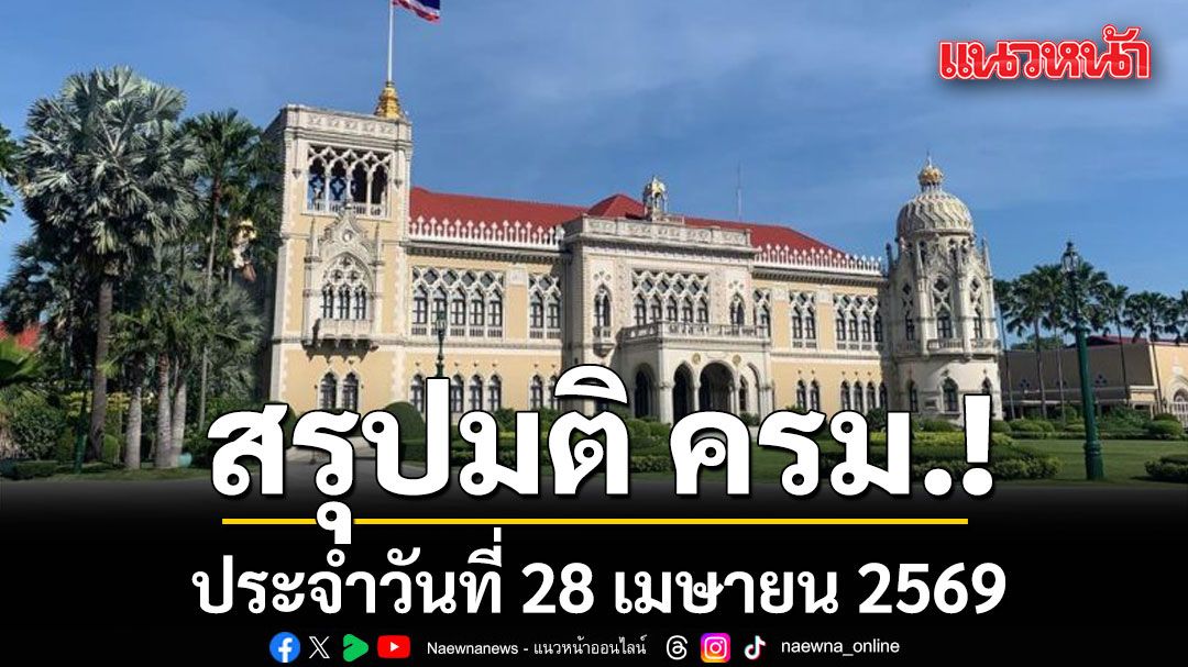 วันที่ 28 เมษายน 2569 เวลา 10.00 น. นายอนุทิน ชาญวีรกูล นายกรัฐมนตรีและ รัฐมนตรีว่าการกระทรวงมหาดไทย เป็นประธานการประชุมคณะรัฐมนตรี ณ ห้องประชุม 501 ตึกบัญชาการ 1 ทำเนียบรัฐบาล สรุปสาระสำคัญ ดังนี้