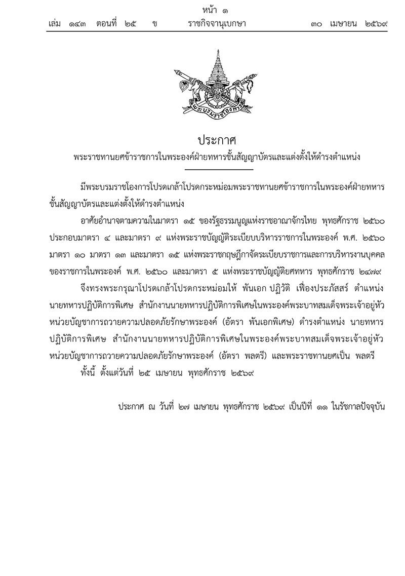 วันที่ 30 เมษายน 2569 เว็บไซต์ราชกิจจานุเบกษา เผยแพร่ประกาศ พระราชทานยศข้าราชการในพระองค์ฝ่ายทหารชั้นสัญญาบัตรและแต่งตั้งให้ดำรงตำแหน่ง