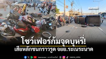 กระบะเสียหลักชนจยย.ระเนระนาด เจ้าตัวรับก้มจุดบุหรี่ เหยียบเบรกพลาดโดนคันเร่ง