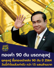 ระบุว่า “..ยุคลุงตู่ ซื้อทองเข้าคลัง 90 ตัน ปี 2564 วันนี้กำไรแล้ว 1 เท่าตัว