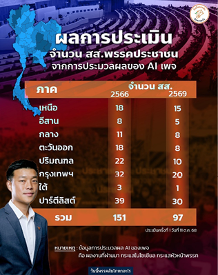 ระบุว่า รวบรวมข้อมูลจากสื่อโซเชียลตลอด 2 ปี ส่งให้ AI ประเมินผลพบว่า พรรคส้มจะเหลือแค่ 97 ที่นั่งหายไป 54 ที่นั่ง