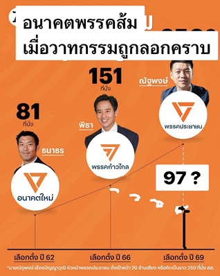 แฟนเพจ วันนี้พรรคส้มโกหกอะไร ประเมินว่า จำนวน สส. พรรคส้ม จาก 151 ที่นั่ง ปี 2566 จะเหลือ 97 ที่นั่ง ในการเลือกตั้งครั้งต่อไป