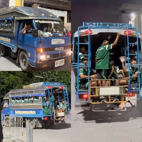 รถบรรทุก 6 ล้อ ที่ทำเป็นรถสองแถว ใช้ขนเด็กๆ ไปแข่งฟุตบอล โค้ชสกลก็ต้องขับเอง รถคันเก่าปุเลงๆ ไปตามจังหวัดต่างๆ