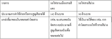 จะเห็นว่า ร.ฟ.ท. (รถไฟชานเมืองสายสีแดง) และ รฟม. (รถไฟฟ้าสายสีม่วง) มีวิธีการคำนวณการสูญเสียรายได้ค่าโดยสาร ที่แตกต่างกัน ดังนี้