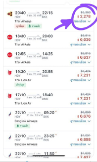ข้อมูลราคาค่าโดยสารสายการบินโลว์คอสต์ข้างต้น เมื่อเทียบกับการบินไทย เส้นทางหาดใหญ่- กทม. เหมือนกัน ราคาต่างกันอย่างเห็นได้ชัด