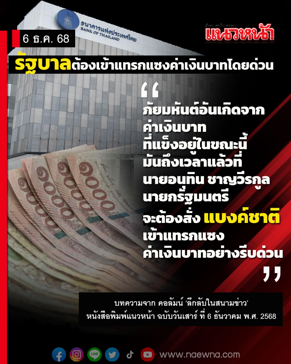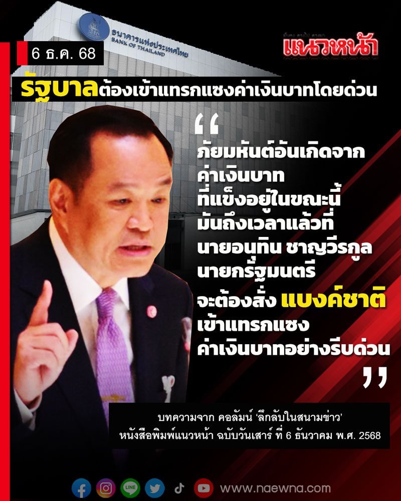 ภัยมหันต์อันเกิดจากค่าเงินบาทที่แข็งโป๊กอยู่ในขณะนี้นั้น มันถึงเวลาแล้วที่ นายอนุทิน ชาญวีรกูล นายกรัฐมนตรี จะต้องสั่งผู้บริหารธนาคารแห่งประเทศไทย หรือ "แบงค์ชาติ"เข้าแทรกแซงค่าเงินบาทอย่างรีบด่วน
