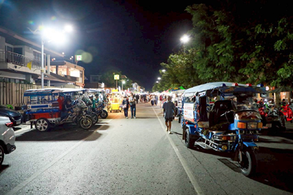 ถนนคนเดินช่วงหัวค่ำ เดินเพลิดเพลิน เพราะอากาศเย็นสบาย Mekong Walking Street ยาวไปจนถึงบริเวณหอนาฬิกาเวียดนามอนุสรณ์ อาหารการกินชิมตลอดสองข้างทาง เดินไป