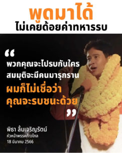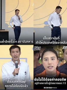 นายธนาธร จึงรุ่งเรืองกิจ ออกมาพูดก่อนนายพิธาเสียอีก บอกว่า สถาบันทหารทำให้ประเทศล้าหลัง ต้องตัดงบทหาร จะมีทหารไปทำไมเยอะแยะ ไม่มีใครเขารบกันแล้ว ทหารไม่ต้องมีแล้ว...
