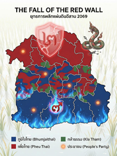 The Red Resistance (การต้านทานของสีแดง): แม้กระแสพรรคจะดิ่งลงเหว (Fallen Giant) แต่การได้บัฟ “พลังอีสาน” ช่วยต่อลมหายใจให้เพื่อไทยใน “อีสานเหนือ” (อุดรฯ/หนองบัวลำภู) ยังคงสถานะ “เมืองหลวงเก่า” ไว้ได้ และทำให้ “อีสานกลาง”กลายเป็นเขตสู้รบที่สูสีเลือดสาด