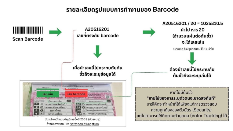 ศ.ดร.ไชยันต์ ไชยพร ยังอธิบายแจกแจงขั้นตอน รายละเอียด ว่าทำไมในปี 2569 กกต. จึงกำหนดให้มี QR code และ Bar code บนบัตรเลือกตั้ง สส. ในประเทศไทย ?ระบุว่า