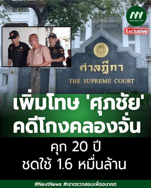 1. สำนักข่าว Next News รายงานว่าเมื่อวันที่ 16 กุมภาพันธ์ 2569 ศาลฎีกาได้มีคำพิพากษาเพิ่มข้อหาและยืนยันบทลงโทษนายศุภชัย ศรีศุภอักษร อดีตประธานบริหารสหกรณ์เครดิตยูเนี่ยนคลองจั่น กับพวกรวม 11 ราย ในความผิดฐานฉ้อโกงประชาชนและลักทรัพย์สหกรณ์คลองจั่นเกือบ 600 กระทง