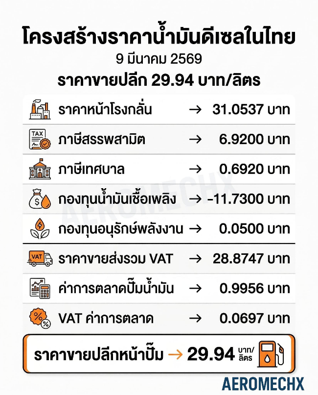 เพจ Aeromechx ได้สรุปข้อมูลโครงสร้างราคาน้ำมันดีเซลแบบง่ายๆ