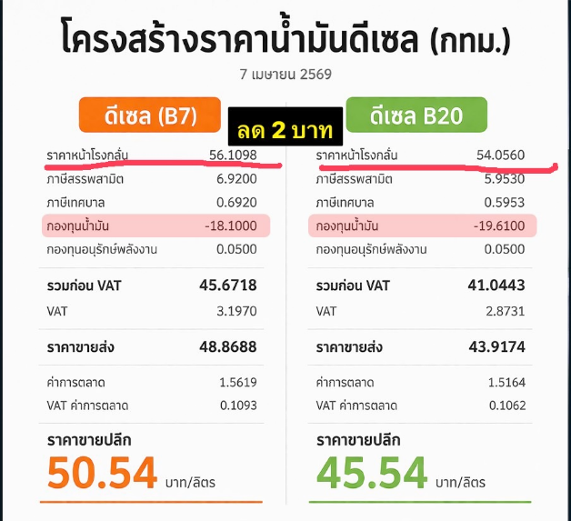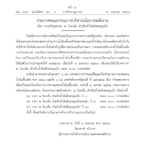 เพื่อประโยชน์ในการแก้ไขและป้องกันการขาดแคลนน้ำมันเชื้อเพลิงคณะกรรมการบริหารนโยบายพลังงานได้มีมติในการประชุมครั้งที่ 2/2569 เมื่อวันที่ 7 เมษายน 2569 เห็นชอบให้ปรับลดราคา ณ โรงกลั่น สำหรับน้ำมันดีเซลหมุนเร็ว ลดลง 2.00 บาทต่อลิตร