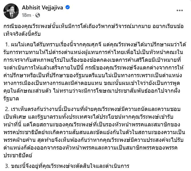 3.ตามที่คุณอภิสิทธิ์โพสต์ แสดงว่า คุณอภิสิทธิ์ทราบว่ามีการทาบทามมาก่อนแล้ว โดยคุณวีระพงษ์เป็นคนแจ้งกับคุณอภิสิทธิ์ และได้หารือกันก่อนหน้านี้