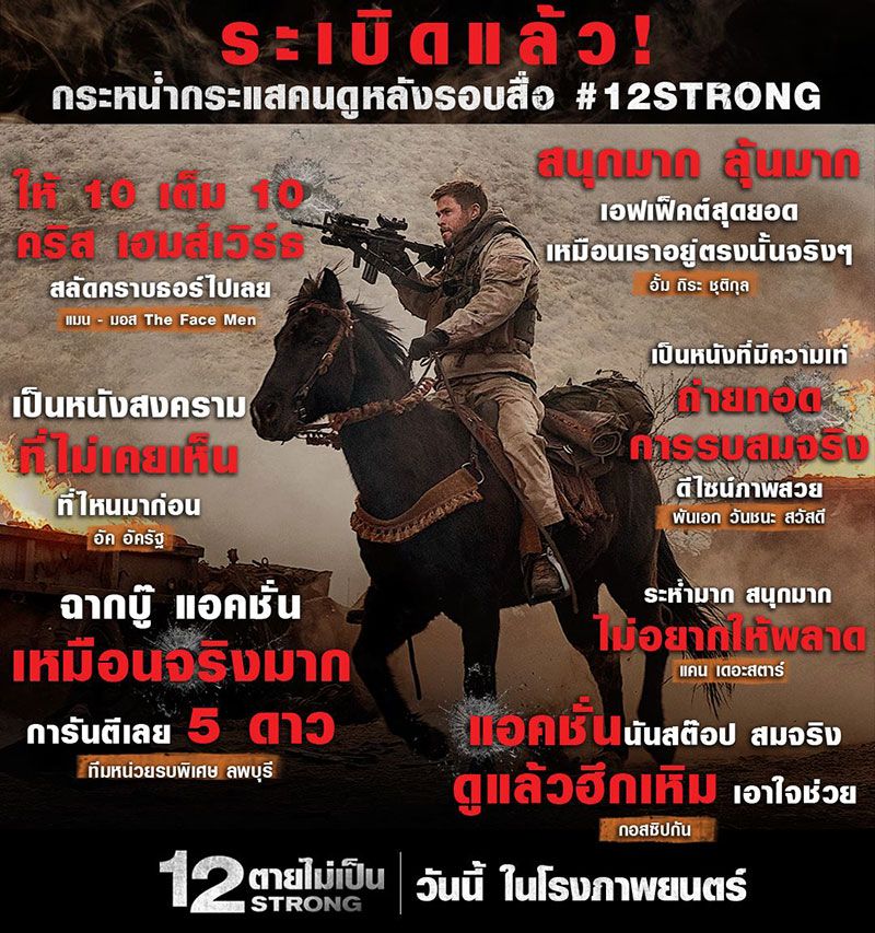 ถึงเวลาแล้วที่คอหนังชาวไทยจะได้มาระอุความมันส์ขั้นสุดไปกับ “12 STRONG 12 ตายไม่เป็น”ที่สุดของภาพยนตร์โคตรแอคชั่นประจำปี 2018 ด้วยเรื่องราวแห่งการต่อสู้โต้กลับสนั่นโลก หลังจากวินาศกรรม 9/11 กำเนิดเกิดวีรบุรุษผู้กล้าของโลก 12 ทหารผู้กล้าหน่วยรบพิเศษกรีน เบอเรต์ กับการเป็นคนกลุ่มแรกที่เดินหน้าสู้ศัตรูแบบไม่กลัวตาย ปฏิบัติภารกิจระดับชาติ ผ่านการนำแสดงโดยซูเปอร์สตาร์ระดับโลก “คริส เฮมส์เวิร์ธ” กับการลั่นสกิลแอคชั่นโชว์ซีนบู๊ระห่ำของจริง และบัญชาการความมันส์โดยโปรดิวเซอร์สายแอคชั่นมือพระกาฬ “เจอร์รี่ บรัคไฮเมอร์” เจ้าของผลงานดังก้องโลกอย่าง Black Hawk Down, Pirates of the Caribbean ทุกภาค, Pearl Harbour และ Armageddon