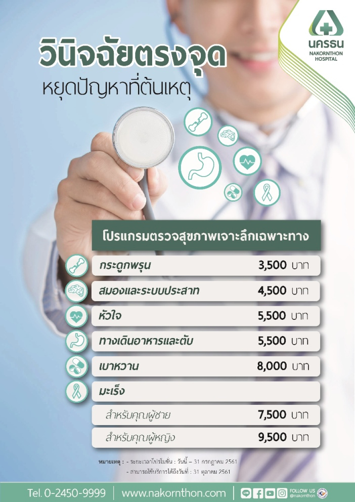 โรงพยาบาลนครธน โรงพยาบาลที่ให้บริการด้วย 15 ศูนย์การรักษาเฉพาะทางที่ครอบคลุมการดูแลสุขภาพทุกด้านและเจาะลึกแบบเฉพาะทางทุกการรักษาโรค จัดแคมเปญ วินิจฉัยตรงจุด หยุดปัญหาที่ต้นเหตุ เอาใจคนรักสุขภาพด้วย โปรแกรมตรวจสุขภาพเจาะลึกเฉพาะทาง ราคาพิเศษ อาทิ การตรวจส่องกล้องกระเพาะอาหารและลำไส้ใหญ่จากศูนย์ทางเดินอาหารและตับ การตรวจวินิจฉัยอาการปวดศีรษะไม่ทราบสาเหตุด้วยเครื่อง MRI จากศูนย์สมองและระบบประสาท การตรวจหัวใจด้วยการฉีดสีหลอดเลือดหัวใจจากศูนย์หัวใจ การตรวจวินิจฉัยอาการปวดหลังที่ต้นเหตุด้วยเครื่อง MRI จากศูนย์กระดูกและข้อ รวมทั้งโปรแกรมการตรวจคัดกรองโรคมะเร็งเฉพาะคุณสุภาพสตรี จากศูนย์รักษ์เต้านมและศูนย์สุขภาพสตรี และยังมีโปรแกรมตรวจสุขภาพเฉพาะทางอีกหลายรายการที่เหมาะกับสุขภาพและอาการของแต่ละบุคคล โดยผู้สนใจสามารถเข้ารับบริการตรวจสุขภาพเจาะลึกเฉพาะทางราคาพิเศษได้ตั้งแต่วันนี้-31 กรกฎาคมนี้ รายละเอียดเพิ่มเติม โทร. 0 2450 9999 หรือ www.facebook.com/nakornthon