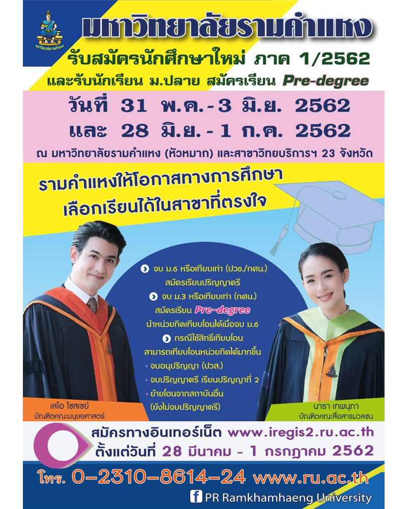 15 พ.ค.62 มหาวิทยาลัยรามคำแหง รับสมัครนักศึกษาใหม่ระดับปริญญาตรี ภาค 1 ปีการศึกษา 2562 ทั้งส่วนกลาง (หัวหมาก) และส่วนภูมิภาค (23 จังหวัด) ระหว่างวันที่ 31 พฤษภาคม – 3 มิถุนายน และ 28 มิถุนายน – 1 กรกฎาคม 2562 (ทุกวัน) และเปิดรับสมัครทางอินเทอร์เน็ตที่ www.iregis2.ru.ac.th ตั้งแต่บัดนี้ - 1 กรกฎาคม 2562 รวมทั้งเปิดรับนักเรียนชั้นมัธยมศึกษาตอนปลายเข้าศึกษาในระบบ Pre-degree เพื่อสะสมหน่วยกิตล่วงหน้า โดยสามารถนำหน่วยกิตมาเทียบโอนได้เมื่อจบ ม.6