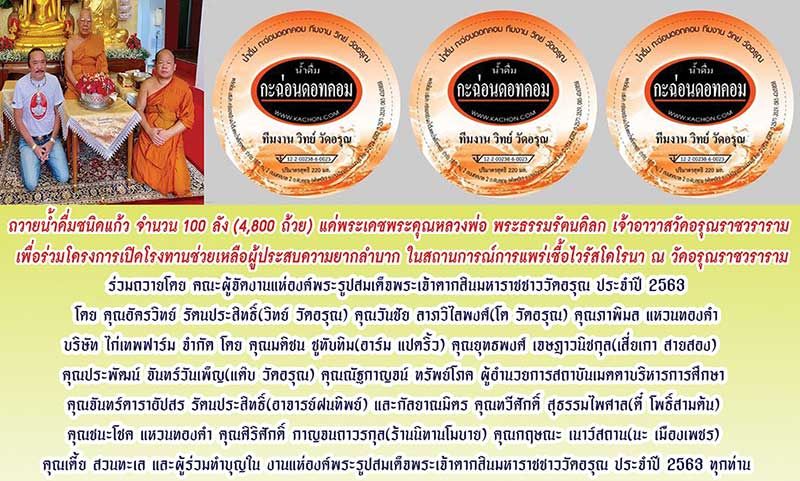 4.ร่วมถวายน้ำดื่มกะฉ่อนดอทคอมชนิดแก้ว(ในเบื้องต้น) จำนวน 100 ลัง(4,800 แก้ว) แด่พระเดชพระคุณหลวงพ่อ พระธรรมรัตนดิลก กรรมการมหาเถรสมาคม เจ้าคณะภาค9 เจ้าอาวาสวัดอรุณราชวราราม เพื่อร่วมโครงการเปิดโรงทานช่วยเหลือผู้ประสบความยากลำบาก ในสถานการณ์การแพร่เชื้อไวรัสโคโรนา ณ วัดอรุณราชวราราม ตั้งแต่วันที่ 27 มีนาคม 2563 - วันที่ 26 พฤษภาคม 2563
