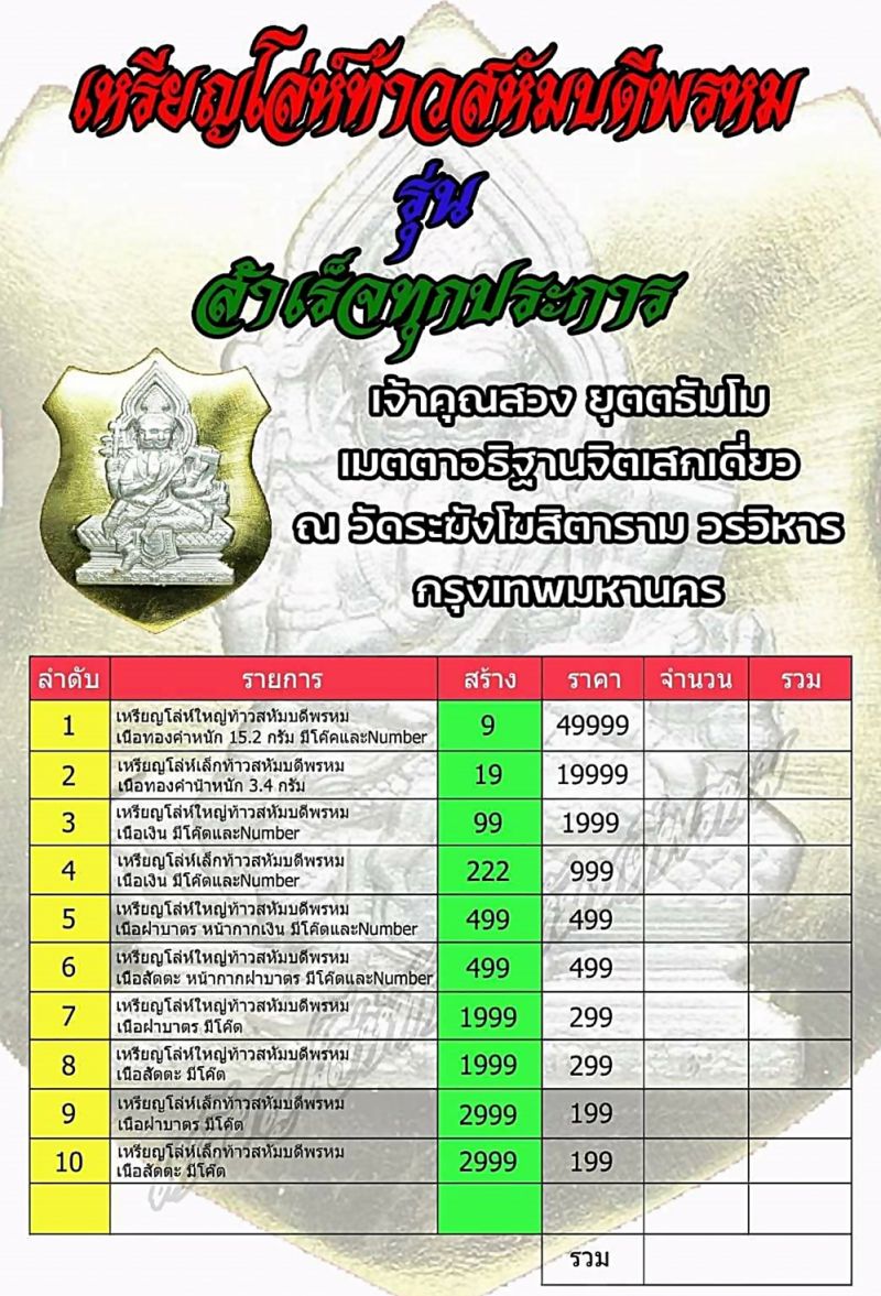1. เหรียญโล่ห์ใหญ่ท้าวสหัมบดีพรหม เนื้อทองคำ จำนวน 9 เหรียญ น้ำหนัก 15.2 กรัม ทุกเหรียญมีตอกโค้ดและ Number กำกับ ราคาจอง 49,999 บาท
