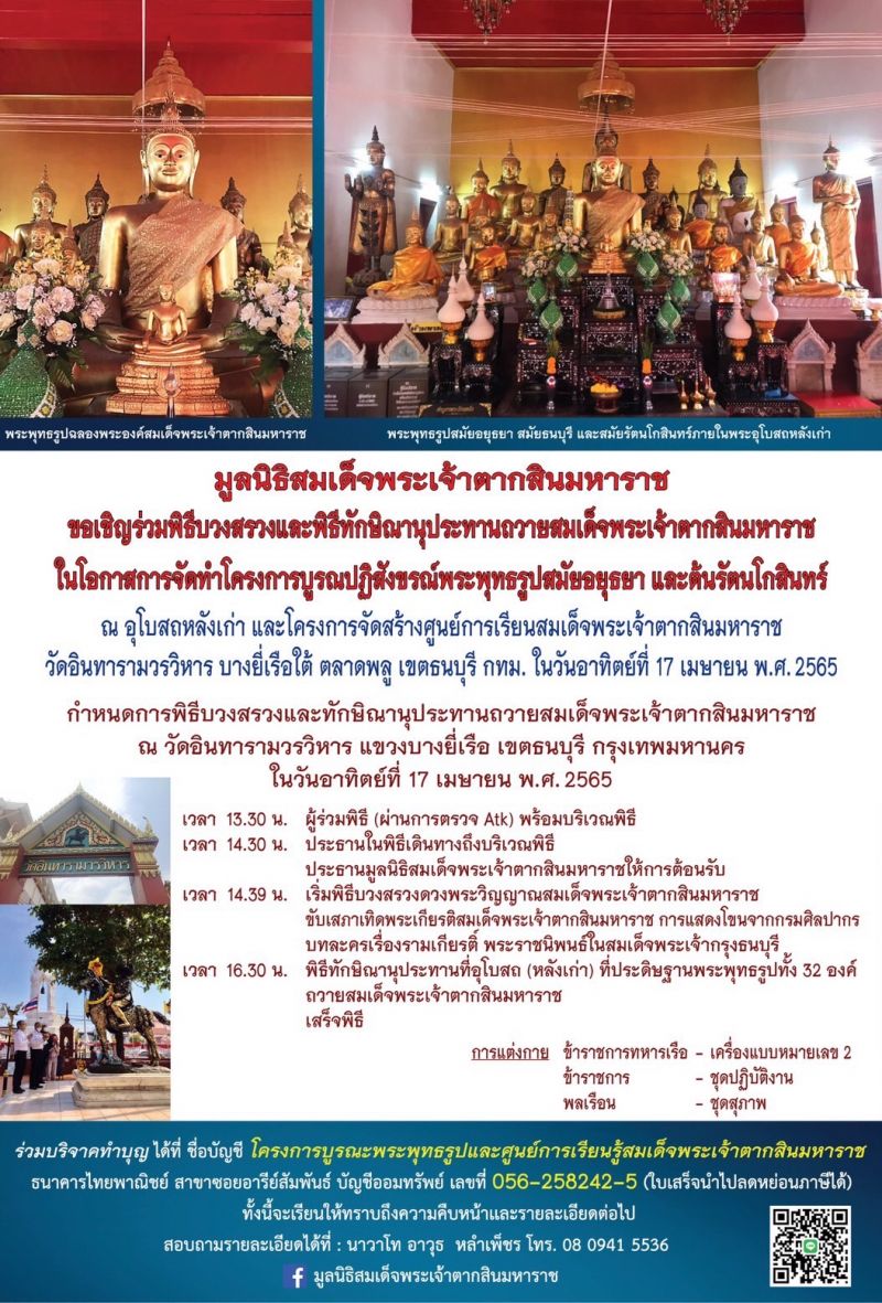 โดยวาระโอกาส ครบรอบวันคล้ายวันพระราชสมภพ ของพระองค์ท่านอีกครั้ง ในวันที่ 17 เมษายน ปี 2565 นี้ ทางมูลนิธิสมเด็จพระเจ้าตากสินมหาราชที่ดำเนินการก่อตั้งมูลนิธิมาตั้งแต่ปี 2523 โดยมีวัตถุประสงค์เทิดทูนและเผยแพร่เรื่องราวของ สมเด็จพระเจ้าตากสินมหาราชที่ทรงมีพระคุณอันยิ่งใหญ่ต่อประเทศชาติและประชาชนชาวไทย รวมไปถึงหลาย ๆ อย่างที่พระองค์ทำไว้ ได้เตรียมสองโครงการกุศลครั้งใหญ่ไว้