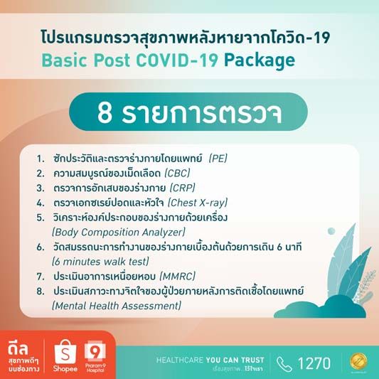โปรแกรมตรวจสุขภาพหลังหายจากโควิด-19 Basic Post COVID-19 ตรวจ 8 รายการ เพียง 2,500 บาท อาทิ ความสมบูรณ์ของเม็ดเลือด (CBC), ตรวจการอักเสบของร่างกาย (CRP), ตรวจเอกซเรย์ปอดและหัวใจ (Chest X-ray), วิเคราะห์องค์ประกอบของร่างกายด้วยเครื่อง (Body Composition Analyzer)วัดสมรรถนะการทำงานของร่างกายเบื้องต้นด้วยการเดิน 6 นาที (6 minutes walk test), ประเมินอาการเหนื่อยหอบ (MMRC), ประเมินสภาวะทางจิตใจของผู้ป่วยภายหลังการติดเชื้อโดยแพทย์ (Mental Health Assessment] เป็นต้น
