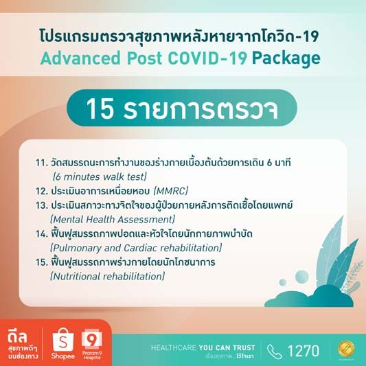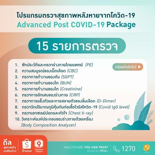 โปรแกรมตรวจสุขภาพหลังหายจากโควิด-19 Advanced Post-COVID-19 เพียง 5,500 บาท ตรวจเพิ่มขึ้นไปอีกรวม 15 รายการตรวจ ไม่ว่าจะเป็น ตรวจการทำงานของตับ (SGPT), ตรวจการทำงานของไต (BUN , Creatinine), ตรวจการอักเสบของร่างกาย (CRP), ตรวจการแข็งตัวและการสลายตัวของลิ่มเลือด (D-Dimer), ตรวจวัดปริมาณภูมิคุ้มกันต่อเชื้อไวรัสโควิด-19 (Covid IgG level), ตรวจเอกซเรย์ปอดและหัวใจ (Chest X-ray), วิเคราะห์องค์ประกอบของร่างกายด้วยเครื่อง (Body Composition Analyzer)ตลอดจน การฟื้นฟูสมรรถภาพปอดและหัวใจโดยนักกายภาพบำบัด (Pulmonary and Cardiac rehabilitation) เป็นต้น