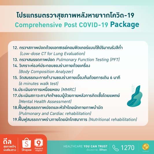 และ โปรแกรมตรวจสุขภาพหลังหายจากโควิด-19 Comprehensive Post COVID-19 เพียง 12,500 บาท กับ 19 รายการตรวจครอบคลุมแบบอุ่นใจ อาทิ ความสมบูรณ์ของเม็ดเลือด (CBC) , ตรวจการทำงานของตับ (SGOT , SGPT , Alk. Phosphatase), ตรวจการทำงานของไต (BUN , Creatinine), ตรวจการทำงานของไต (Creatinine), ตรวจสภาพปอดด้วยเอกซเรย์คอมพิวเตอร์แบบใช้ปริมาณรังสีต่ำ (Low-dose CT for Lung Evaluation), ตรวจสมรรถภาพปอด Pulmonary Function Testing (PFT) และวิเคราะห์องค์ประกอบของร่างกายด้วยเครื่อง (Body Composition Analyzer) เป็นต้น
