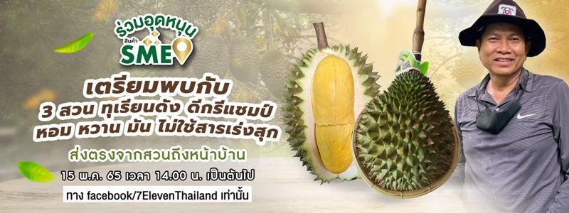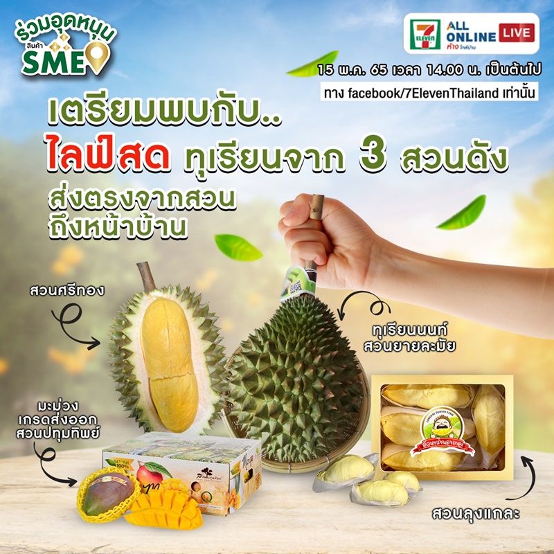 ใครอยากลิ้มรสความหวาน มัน อร่อยของทุเรียน 3 สวนดัง และช่วยอุดหนุนผลไม้จากเกษตรกร ช้อปสะดวกๆ ส่งถึงหน้าบ้าน พบกันได้ทางเฟซบุ๊ก 7-ElevenThailand วันอาทิตย์ที่ 15 พฤษภาคมนี้ เวลา 14.00 – 15.00 น. รอเอฟกันได้เลย