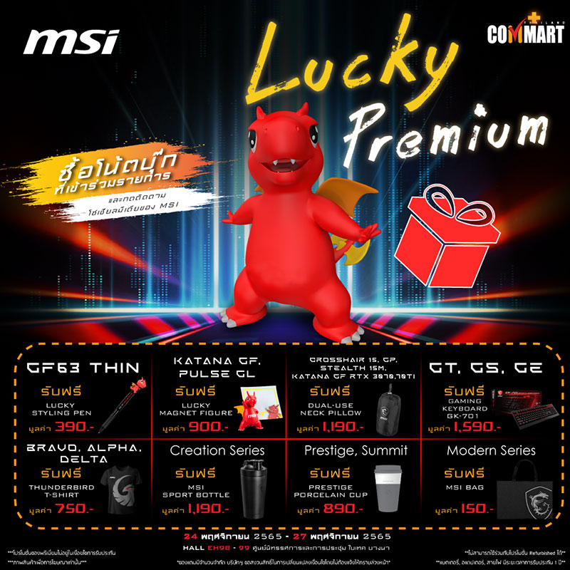 รวมถึงยังมีโปรโมชั่นของพรีเมี่ยมแบบ Limited จาก MSI อีกมากมายสำหรับผู้ที่ซื้อภายในงาน