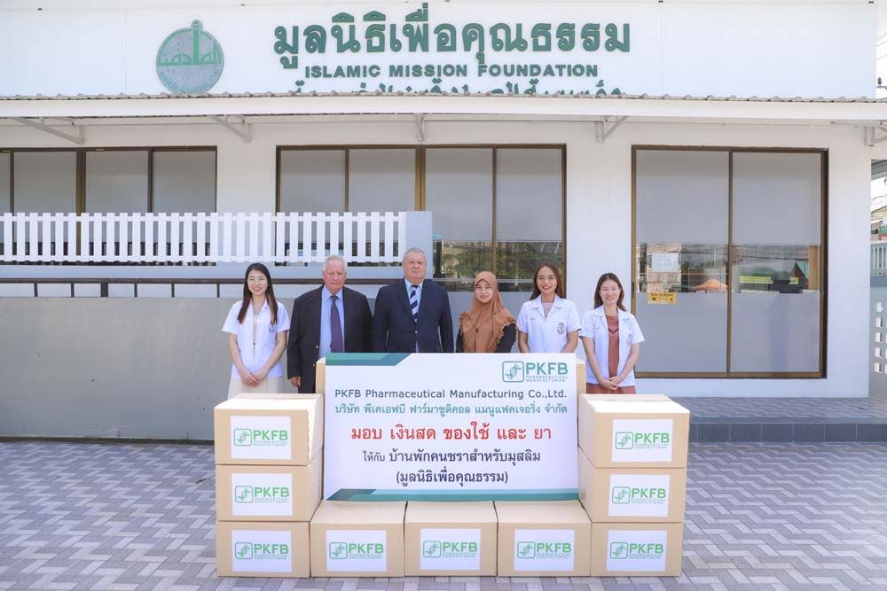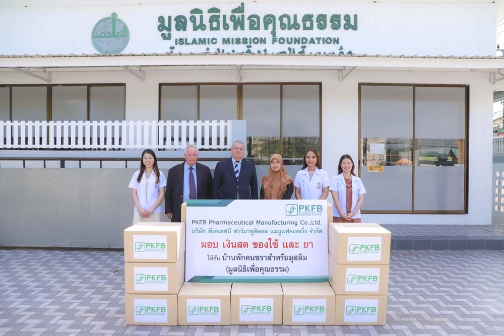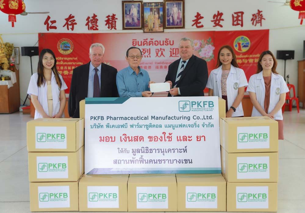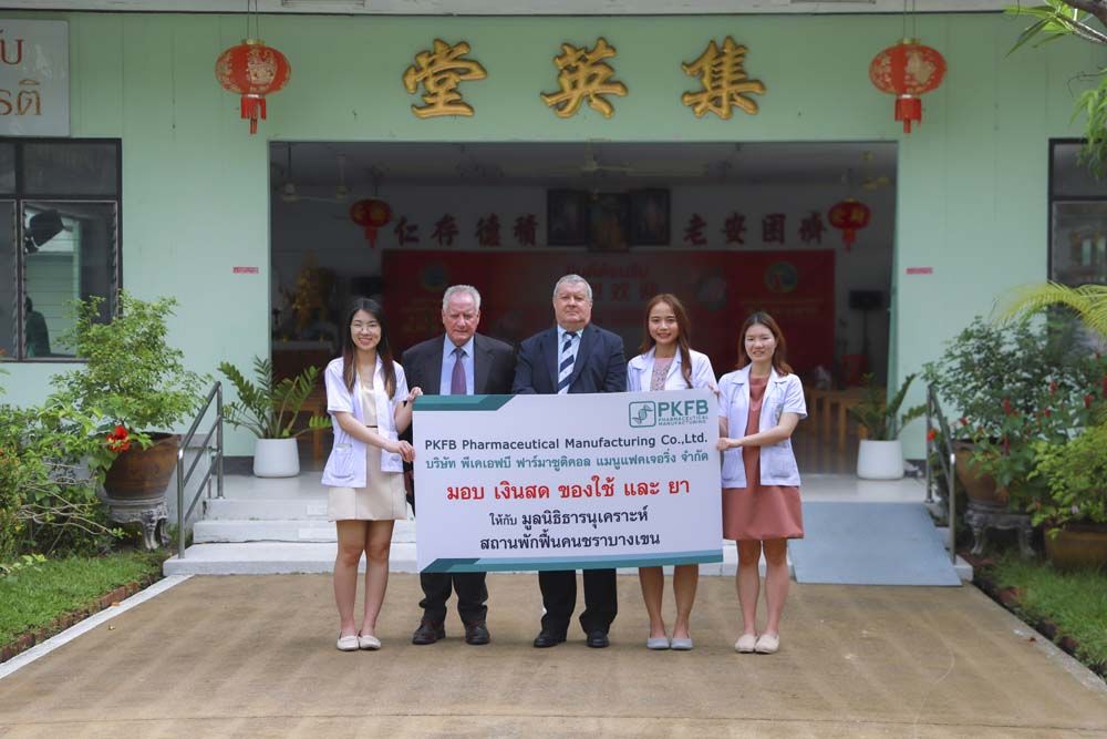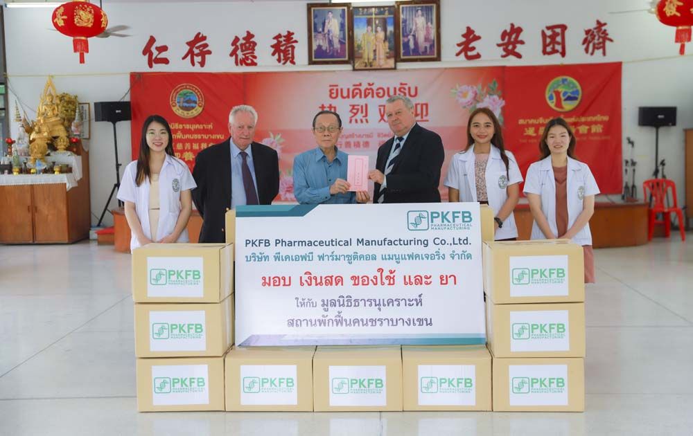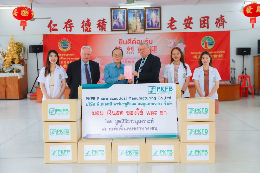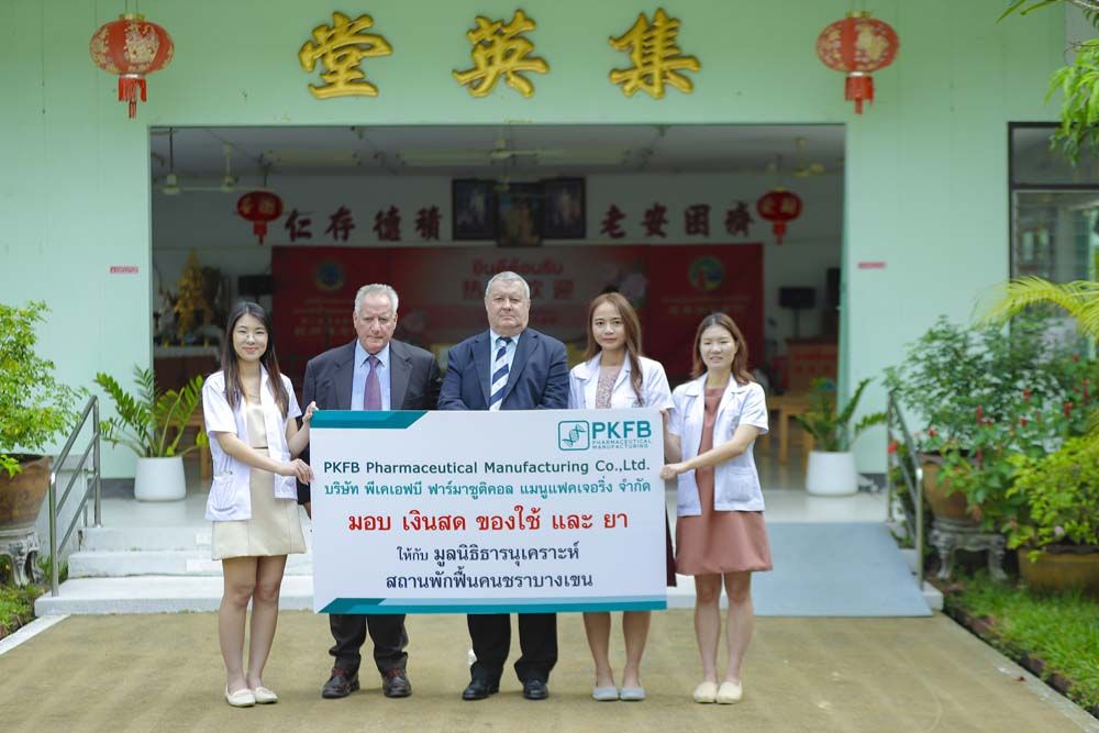 ตัวแทนคณะผู้บริหาร PKFB Pharmaceutical Manufacturing Co., Ltd. บริษัท พีเคเอฟบี ฟาร์มาซูติคอล แมนูแฟคเจอริ่ง จำกัด โดย Mr.Neville John Nicholson ,Mr.Alan James Lammin ,ภญ.โชติกา ธนาไสย์ ,ภญ.ชนิสรา สิขรีไพศาล และ ภญ.ศรัณย์รัฐ พรมไพสนภญ เป็นตัวแทนมอบ เงินสด พร้อมสิ่งของเครื่องใช้อุปโภคบริโภค และ ยารักษาโรค ให้กับ มูลนิธิธารนุเคราะห์ สถานพักฟื้นคนชราบางเขน โดยมี คุณวิสุทธิ์ ปัญจะวัฒนันท์ ผู้จัดการมูลนิธิธารนุเคราะห์ เป็นผู้รับมอบ และ บ้านพักคนชราสำหรับมุสลิม มูลนิธิเพื่อคุณธรรม โดยมี สุรัชญา สากลวารี เป็นผู้รับมอบ